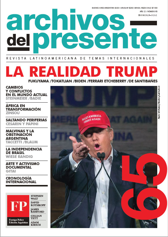 El número 65 de la Revista Archivos del Presente tiene como tema principal la victoria de Donald Trump como presidente de Estados Unidos y las potenciales consecuencias para el mundo, en general, y para nuestra región, en particular. El análisis de este hecho histórico reúne diversas posturas a cargo de Alberto Ferrari Etcheberry con su artículo “Es la desigualdad, estúpido”; Francis Fukuyama, “¿Deterioro o renovación de la política estadounidense?”; Juan Gabriel Tokatlián, “La Argentina y Trump” y Francisco de Santibañes, “Trump: ¿El inicio de una nueva era?”. Además, dentro de esta sección se incluye un artículo del saliente vicepresidente de Estados Unidos, Joseph R. Biden Jr., denominado “Construyendo sobre el éxito”.