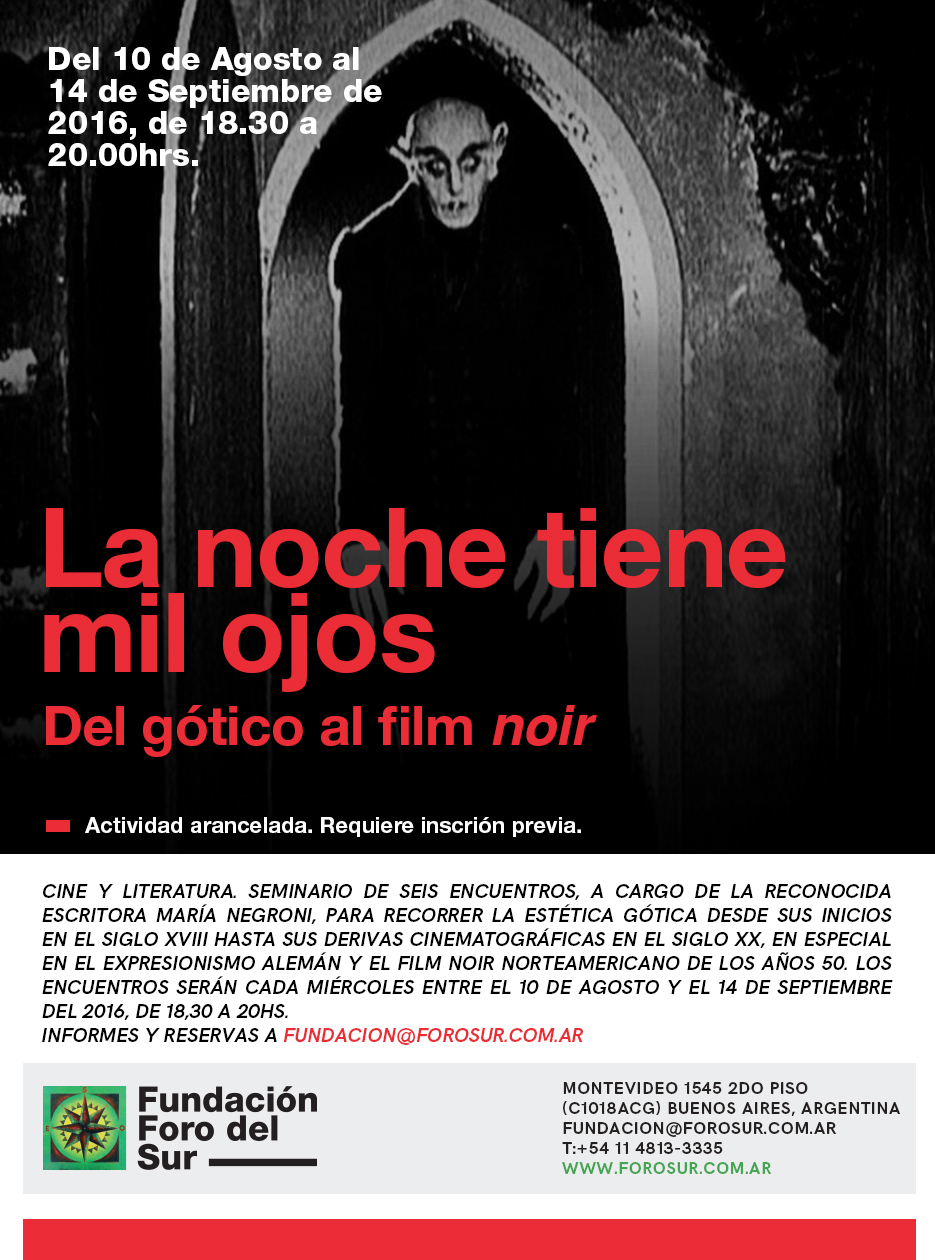 The aforementioned course, by Maria Negroni, had its axis set on the Gothic novel, born in the 18th century England, with the purpose of showing how its influence persists in European, Latin American and American literature and art. Through audiovisual material and film, the course showed how the most conspicuous topics of the Gothic novel -the black dwelling, urban phantasmagorias, the predilection for ruin and night, the conception of the artist as an orphan, the vampire and the criminal, and the endless opus nigrum of creation- reappear with subtle changes both in the American "crime novel" of the 1950s as well as in the cinema that derived from it: the film noir. Parallels and links were established between the urban underworld of crime and prostitution, alcohol and loneliness, the culture of cars and war, the realm of femme fatales and detectives and where the "policeman" manages to unmask the true face of the "American dream", with its hypocritical Protestant morality and its individualistic and efficient nightmare.